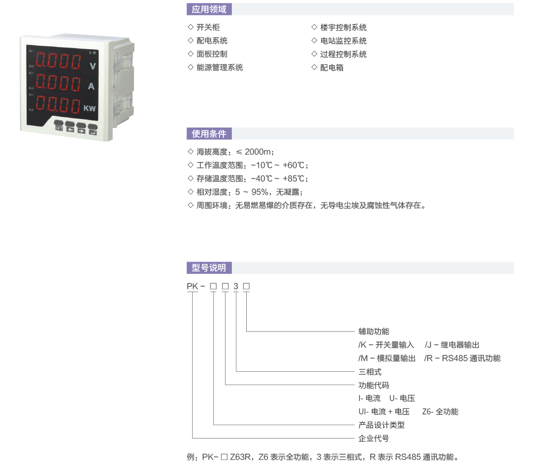 PK系列智能数字仪表是一种具有可编程测量、显示、数字通讯和多种输出功能于一体的电力仪表。是针对电力系统、公用建筑的电力监控和电能管理需求而设计。该系列仪表测量电网中电流、电压、有功功率、无功功率、频率、功率因数、电度等电力参数。采用可编程设计,各项参数均可通过面板进行设置,如CT变比、PT变比、通讯参数、变量输出参数等等,产品应用更加灵活。